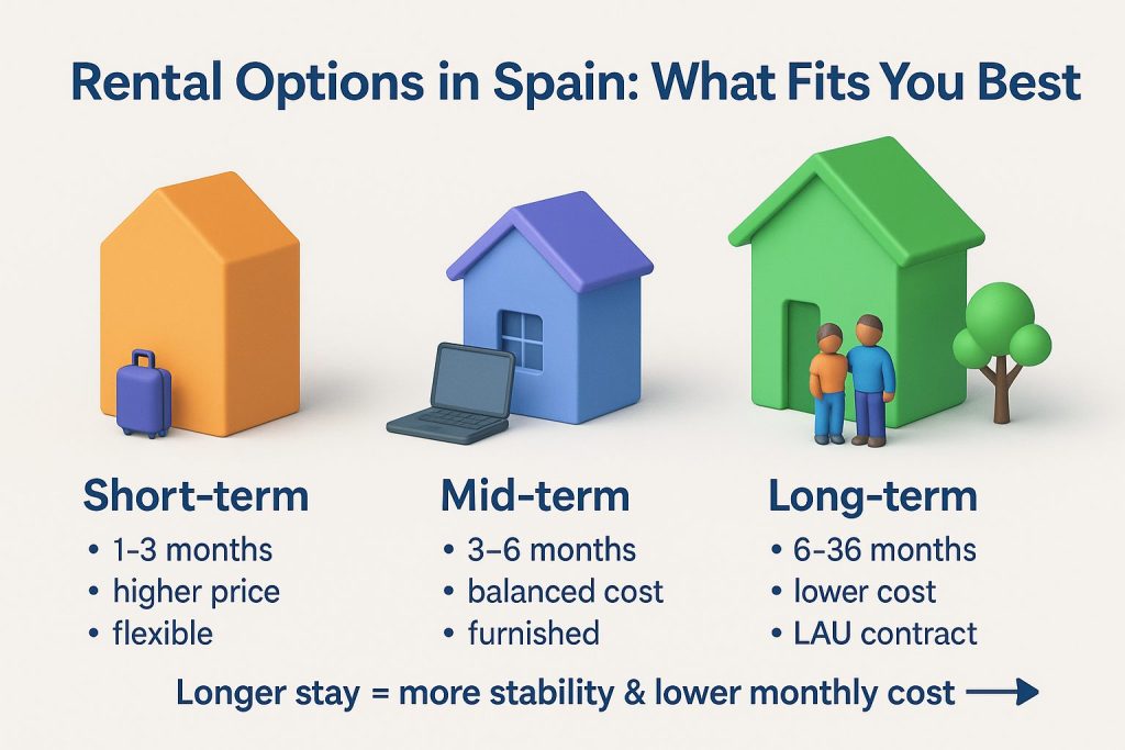 | Long‑term | 6–36 months | Lower | Sometimes unfurnished | Families, stable assignments | Follows Ley de Arrendamientos Urbanos (LAU) |