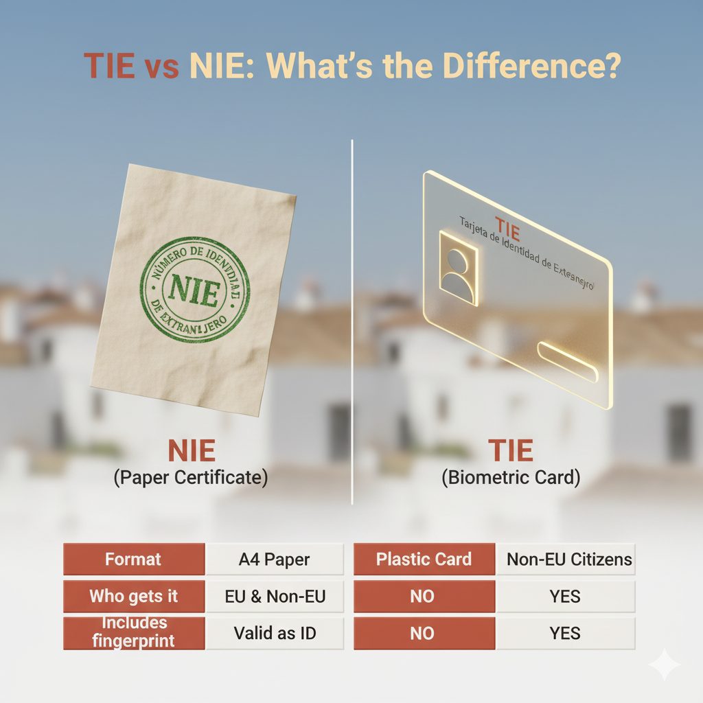 Many newcomers confuse the two, so let’s clear it up. The NIE (Número de Identidad de Extranjero) is simply a tax identification number. It can exist without a physical card. The TIE, on the other hand, is the actual card that proves your residence.